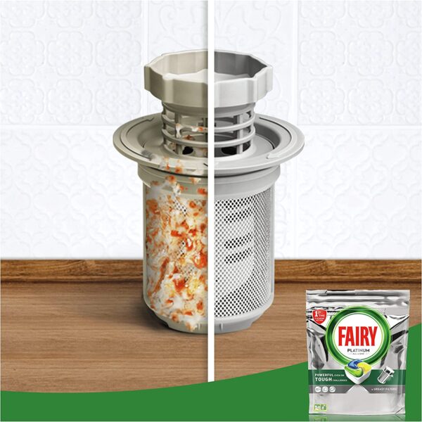 Fairy Platinum All in One dishwasher tablets deliver 1st time cleaning action and tackle even the tough cleaning challenges to get your dishes sparkly clean. Fairy Platinum has the cleaning power that gives you the confidence to cook anything you like, knowing it even takes care of your greasy filter for clean dishes and a fresh dishwasher. Fairy combines liquid and powder in one powerful capsule. Its ultra soluble pouch dissolves fast, so it starts cleaning quickly to get the job done. And they are so easy to use! No unwrapping needed, just place them in your dishwasher detergent dispenser.