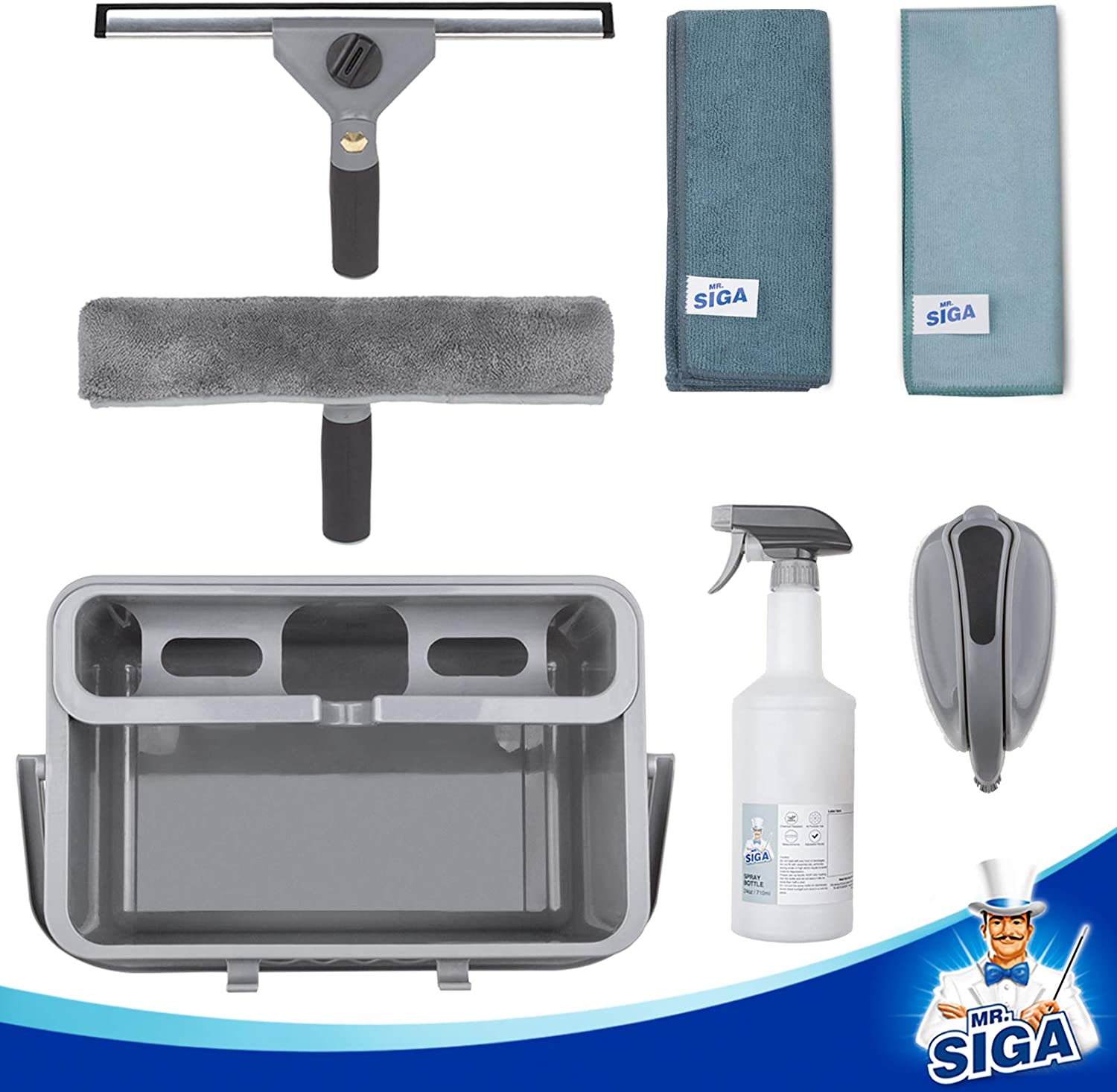 Consisted of sturdy rectangular caddy, durable ABS transparent cover and easy toting, perfect for storing cleaning products and supplies. Detachable rack inside the caddy is designed for storing microfiber window scrubber particularly, while the outside hooks are for hanging window squeegee. Holds up to 15 L water to assist your daily household cleaning. 12 inch microfiber window scrubber attracts fine dust and absorbs water easily, it’s detachable and machine washable. Flexible yet durable 12 inch silicone window squeegee easily removes soap scum, water drops and limescale but leaves no streaks. Stainless steel clip and durable silicone blade ensure much longer lifespan than rubber squeegee. 2 in 1 multi-purpose scrub brush includes a scrub brush and a small angled grout brush snapped in the handle. Durable PP bristle is great for cleaning bathroom, kitchen, tiles, garage, they are firm enough to stand up after sustained use. The small angled brush can be taken out easily for separate use, which is ideal for cleaning narrow spaces and crevices. Thick absorbent frost teal microfiber cloth captures dust, dirt and grime like a magnet, it soaks up water from countertop and tables quickly without lint or streaks left behind, can be widely used for worktops, appliances to kitchens, bathrooms; And another ultra fine sand green microfiber cloth ensures excellent performance especially in cleaning glass, window, mirror, lens, stemwares and leaves no streaks or lint on surfaces. Adjustable nozzle of spray bottle can be switched easily from mist, stream or to off with just a simple turn. There are measurements on the bottle which make it easier to see how much contents remain inside. MR.SIGA’s mission: Make your housework easier, and make the world cleaner. If you’re not happy about the product, you’re covered by a full refund. Please do not hesitate to contact us with any questions you may have, we are here for support and advice!